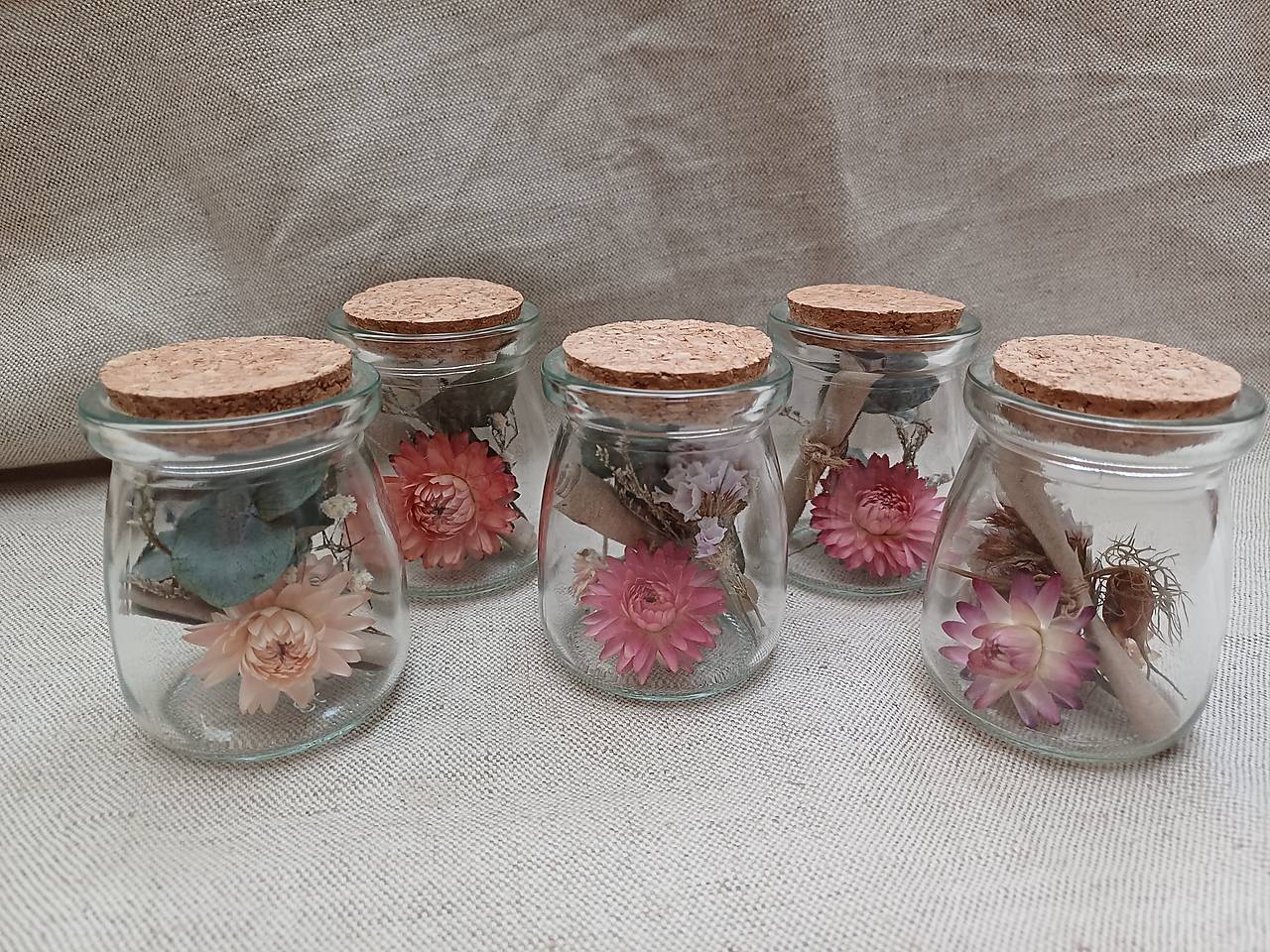 Dekorácia sklenej fľaštičky s korkovým uzáverom. Vo vnútri fľašky sú sušené kvety a rastliny a tajomná správa, ktorú si môžete podľa vlastnej predstavy dopísať.
