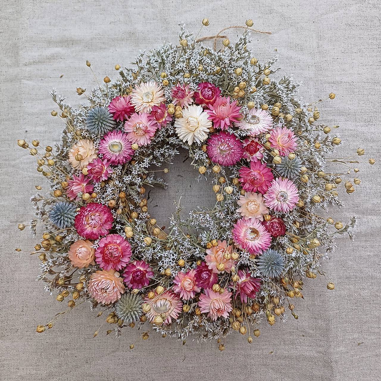 Malý venček na slamenom základe zo sušených kvetov gomfrén, slamienok a plamenníka.