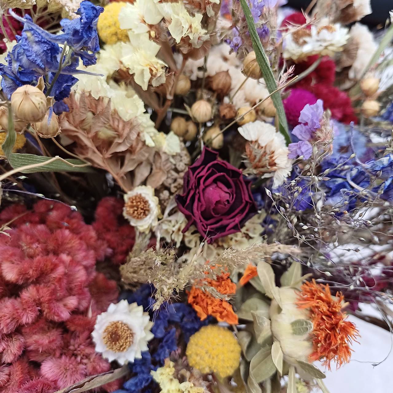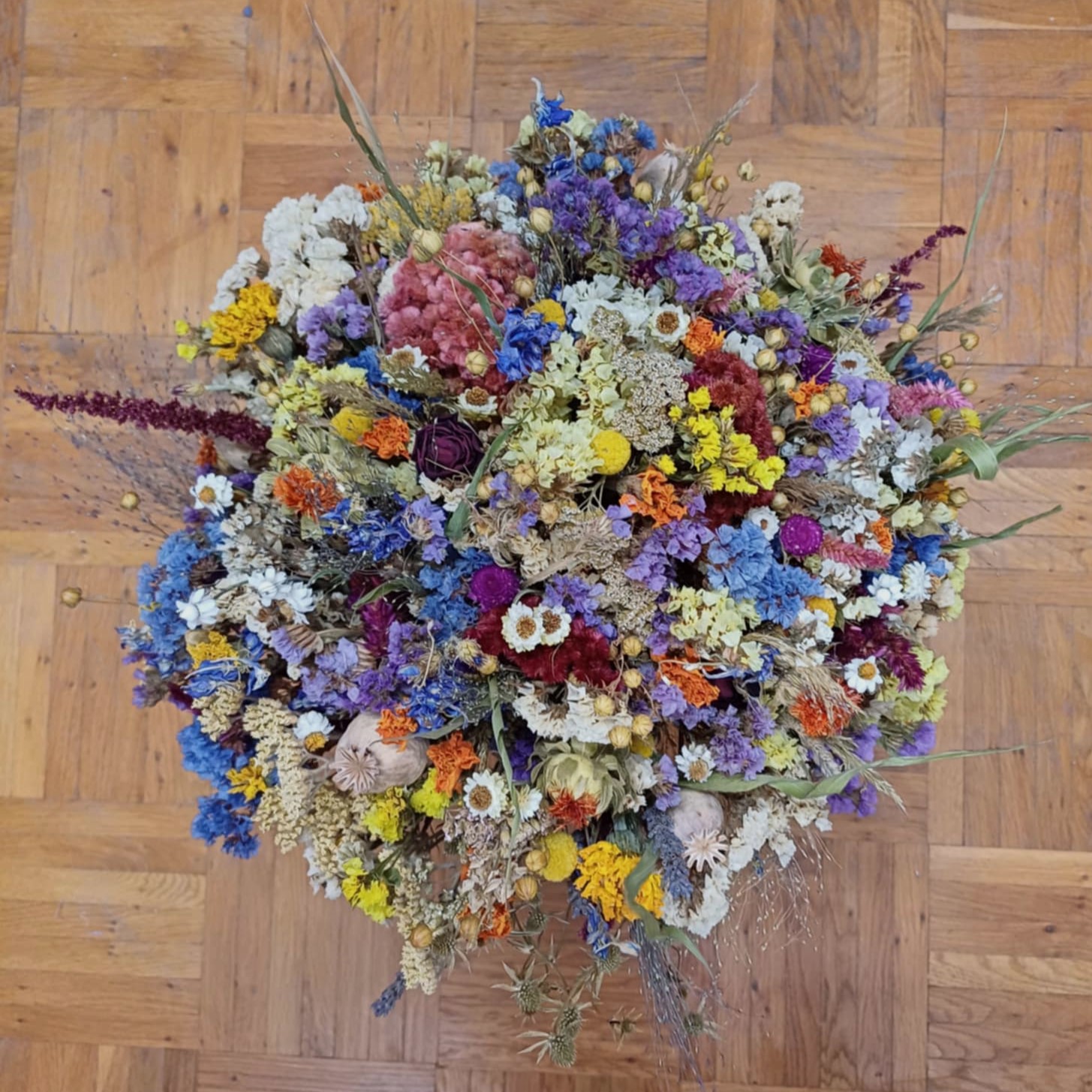 Farebná kytica z rôznych sušených kvetov( limonky, piesočník, plamenník, proso)