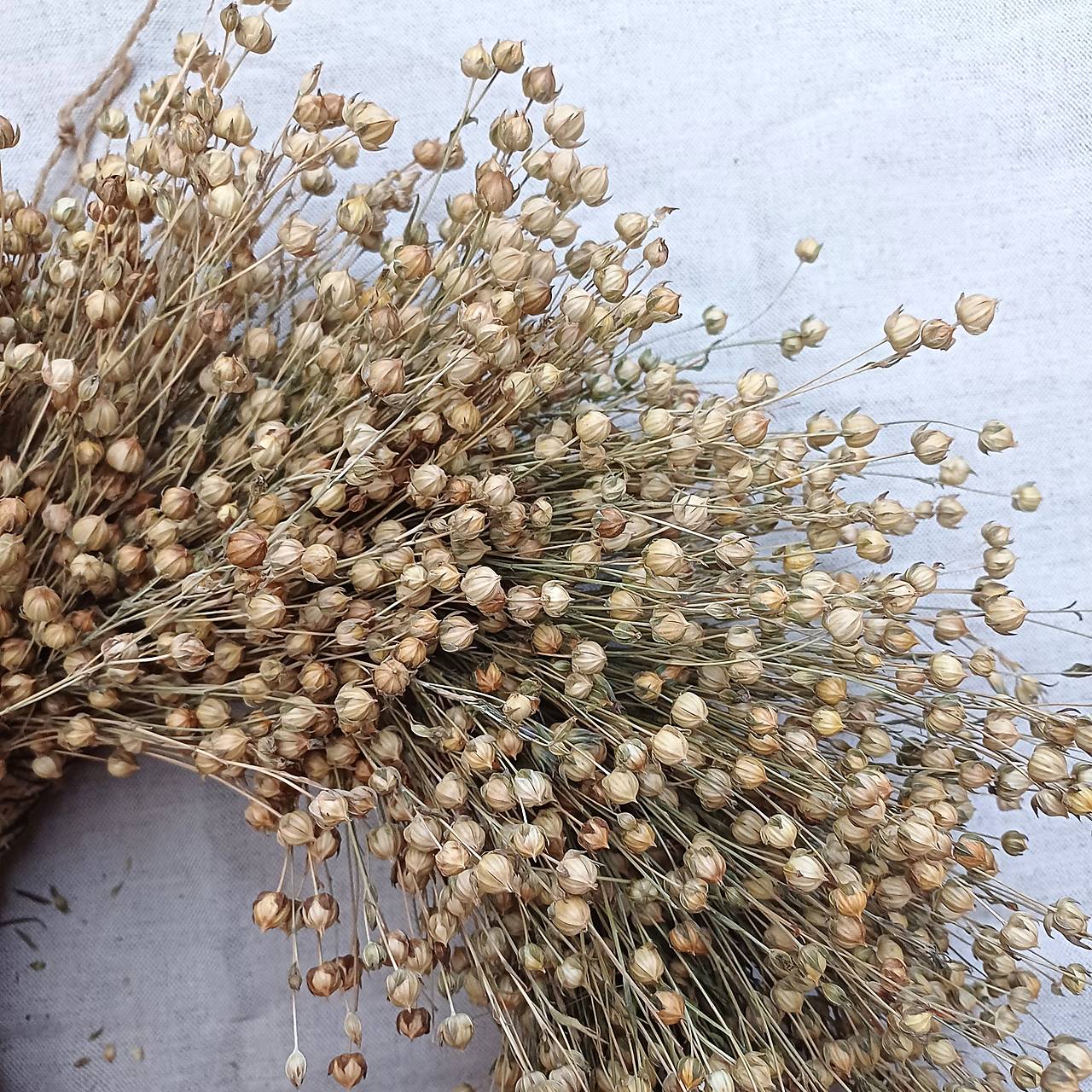 Veniec zo sušeného ľanu na slamenom základe.