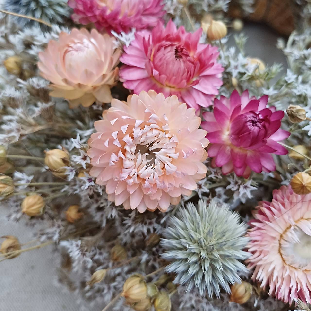 Veniec zo sušených kvetov limonky tatárskej, ľanu, a vlepovaných slamienok a ježibaby.